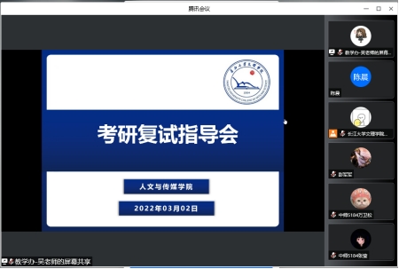 本网讯(通讯员 吴云)2022年3月2日,我院线上召开了2018级学生考研复试指导会。本次会议由人文与传媒学院院长罗勋章教授主讲,党总支副书记张曦、2018级辅导员以及考研学子参加了本次会议。会议由教学办吴云老师主持。