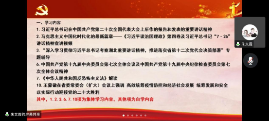 政治理论学习环节,全体教职工集中学习以下内容:习近平总书记在中国共产党第二十次全国代表大会上所作的报告和发表的重要讲话精神、《习近平谈治国理政》第四卷“马克思主义中国化时代化的最新篇章”、中国共产党第十九届中央委员会第七次全体会议及中国共产党第十九届中央纪律检查委员会第七次全体会议精神,以及“深入学习贯彻习近平总书记考察湖北重要讲话精神,推进落实省第十二次党代会决策部署”专题内容。