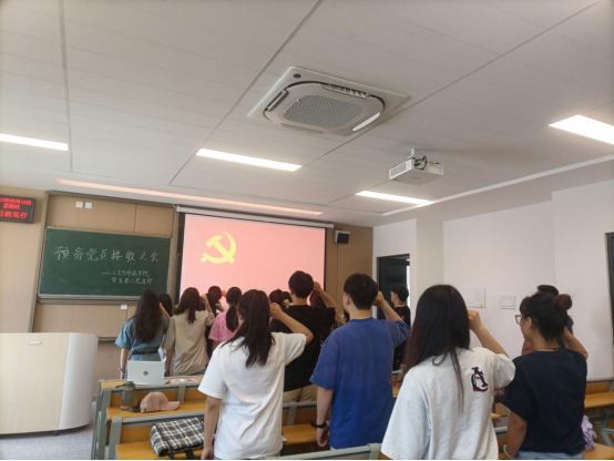 各支部书记发言后,宣布大会正式开始。新接收的预备党员同志依次上台说明自身情况并表态,介绍人依次发表了推荐意见,各党支部正式党员对新接收的预备党员进行了民主投票,全部高票通过。新接收的预备党员同学们在党旗下庄严宣誓,表达对党组织忠诚、传承红色基因和为人民服务的决心。