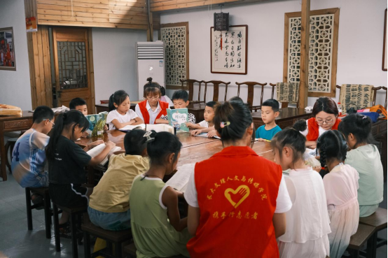 图为实践队队员带领锣场镇学生研读红色经典书目。中国青年网通讯员黄小雅供图