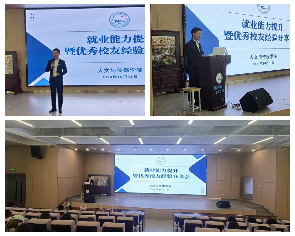 10月31日晚,人文与传媒学院在B-112学术报告厅举办了就业能力提升暨优秀校友经验分享会。2004级广播电视新闻学专业校友、湖北省工商联行协工委常务秘书长黄召超分享了毕业后的就业、创业经历,以“我想成为一个怎样的人”为话题,从自我认识、就业心态、能力储备、面试技巧、职场话术等方面鼓励同学们要尽早明确目标,做好职业规划,打“有准备的仗”;2006级广播电视新闻学专业校友、神农架林区融媒体中心总会计师程鑫结合自身发展经历,告诫同学们珍惜在校时光,切勿眼高手低,积极拓宽知识面,不断提升实践能力和创新能力。