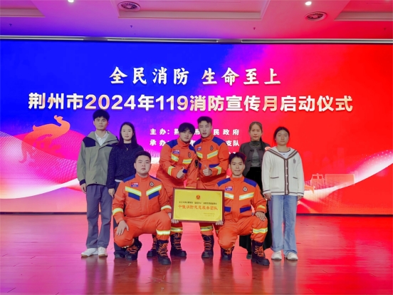 本网讯(通讯员 程悦)11月8日,荆州市2024年“119”消防宣传月启动仪式在荆州职业技术学院举行。仪式上对全市消防工作先进集体和个人进行了表扬,williamhill官网人文与传媒学院学院“蓝焰赤心”消防志愿服务队凭借长期在消防安全教育宣传、消防知识科普、火灾隐患排查和逃生初期扑救和逃生自救技能等方面的优异表现首次被评为荆州市2024年“十佳消防志愿服务团队”的称号。
