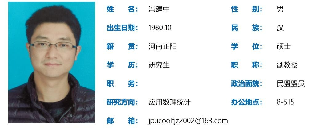 冯建中,河南正阳人,硕士,长江大学信息与数学学院副教授,湖北省现场统计协会会员,荆州市民盟新盟员支部委员,主要从事高等数理统计的教学与研究工作。主持、参与多项科研项目7项,主持校级教研项目2项,公开发表科研论文 30余篇,其中SCI、EI检索各一篇,中文核心6篇。指导全国大学生数学建模竞赛,获得国家一等奖2次,国家二等奖4次,近五年获得长江大学教学质量优秀奖3次,获得长江大学教学工作突出贡献奖4次,2020年获得长江大学任大龙奖教金。