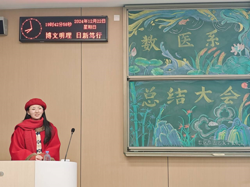 本网讯(见习记者郭瑶瑶)2024年12月22日19:00,数学与医护系第五届学生会2024-2025学年第一学期总结大会在A410教室举行,参会人员有数医系辅导员宋静静老师,数医系学生会主席团及学生会全体成员。