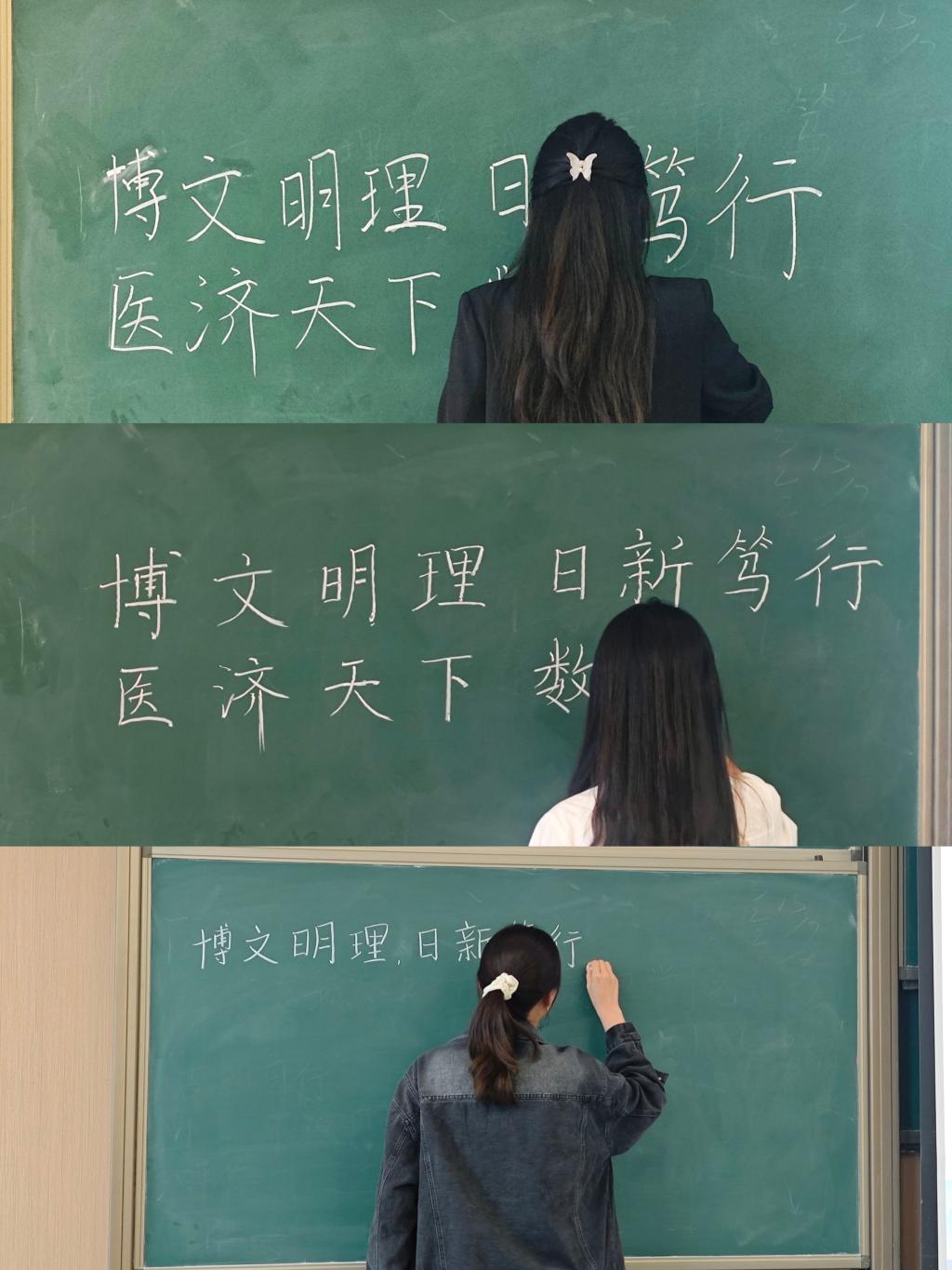 比赛分为初赛和决赛两个部分。比赛开始后,选手们很快专注地投入到书写当中。他们一手拿着粉笔,一手压着黑板,沉着冷静地完成自己的作品,经过评委点评打分最终有五名选手进入决赛。决赛环节难度升级,题目包含生僻字、繁体字等,需在五分钟之内完成,并对自己的书写技巧和注意事项进行讲解。本次比赛不仅考验选手的书写与板书能力,还考验了选手创作与临场发挥能力。