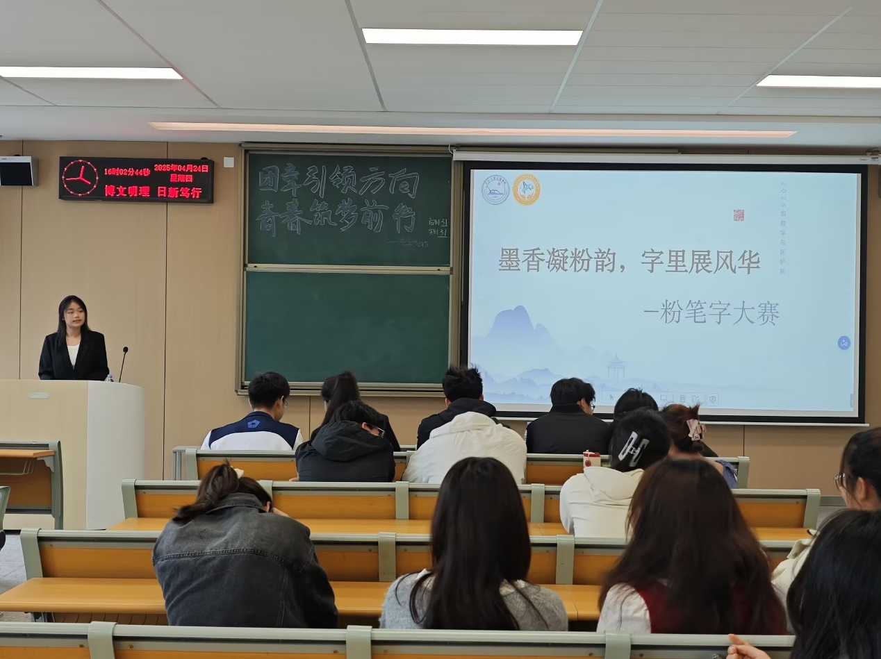 本网讯(见习记者崔雨欣)为夯实学生教师技能基本功,规范板书书写,提高板书设计水平,引领学生提升专业教学技能,数学与医护系于4月24日下午4:00在A-410教室举办了“墨香凝粉韵,字里展风华”粉笔字大赛。本次比赛由数医系团总支学生会文体部主办,共11名选手参加。