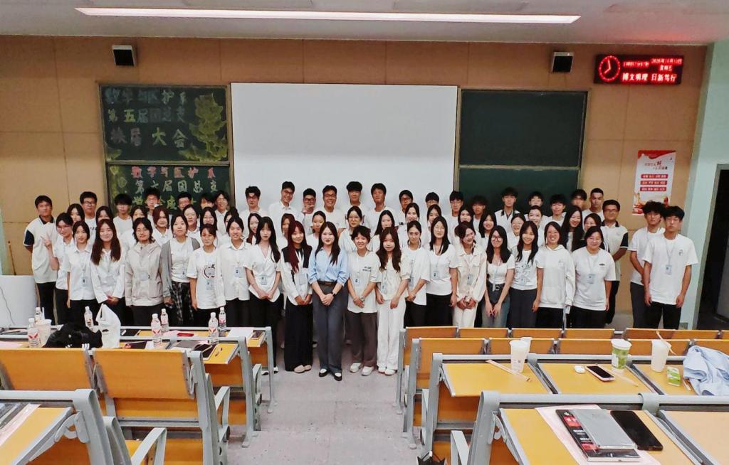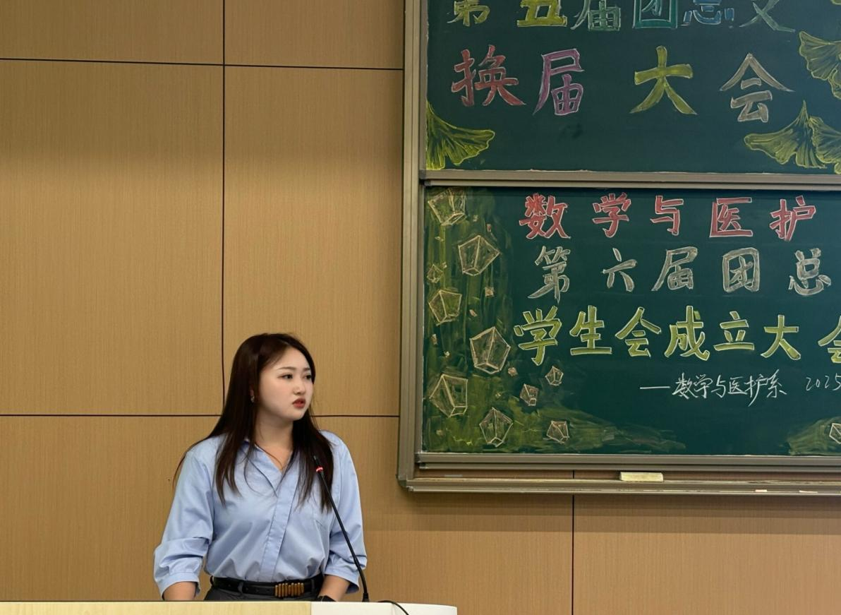 本网讯(见习记者郭傲依林)2025年10月10日19:00,数学与医护系第五届团总支学生会换届大会暨六届团总支学生会成立大会在教学楼B-213教室举行,参会人员有数学与医护系党总支副书记燕梦蝶、数医系第五届团总支学生会、第六届团总支学生会以及七色花志愿者服务队全体成员。