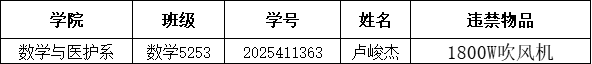 在2025-2026学年第一学期第15周寝室安全卫生检查中,以下同学被查出在宿舍使用违规电器。根据williamhill官网《学生手册》中《williamhill官网宿舍管理条例》第三章第十六条及《williamhill官网学生违纪处分办法》第二十三条相关规定,给予卢峻杰系部通报批评的决定,取消其本学年评优评先资格。