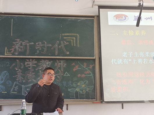 本网讯(见习记者 张子慧 陈双双)11月25日14:30,我系在四教500开展以“新时代小学教师素质探讨”为主题的讲座。本次讲座旨在让同学们明确怎样具备良好的核心素养、过硬的教师素质,发展成为新时代所需要的教师。本次讲座由荆州市实验中学小学部贺波主任主讲,出席讲座的嘉宾有数学与医护系主任史千里、副主任袁萍、兼职主任冉庆鹏、教育技能实训指导老师王春鸽。