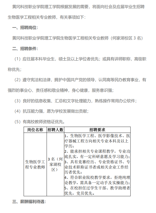 黄冈科技职业学院理工学院 2025 年生物医学工程相关专业教师招聘公告