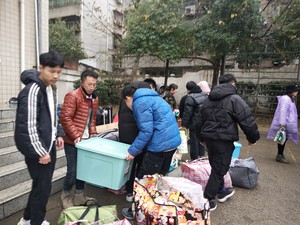 本次搬迁遇到的最大困难是天气。早上九点多,东区南苑大门口,最后一拨学生行礼尚未完全装上车,调皮的小雨就开始淅淅沥沥来捣乱。上午九点四十左右,12辆车陆续到达沙市校区基础医学院,雨雪也更加任性和放肆,一会哗啦啦一阵,一阵淅沥沥一拨,一会突然雪停雨住。为了加快搬运进度,沙市校区相关领导从药房实验室等各部门给同学们借来了推车,系部李书记康书记和沙市校区罗主任直接加入到热火朝天的搬运队伍中。直到12点所有学生行礼都搬进宿舍,雨雪依然胡闹的叫嚣。几乎所有师生被汗水和雨水反复洗礼。