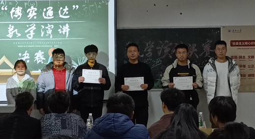 进入决赛的9名选手按抽签顺序依次演讲,选手们不负众望,都以自信十足的姿态、饱满的热情、慷慨激昂的语言描述了对数学的热爱,更有肢体语言的合理配合,博得了台下观众的阵阵掌声和声声加油,带领观众在学习数学知识的同时,充分感受到数学的魅力。优美的声音,激昂的语调,流畅的幻灯片,把现场气氛一次又一次的推向高潮,在场的观众和评委共享着这一视听盛宴。比赛结束后,数医系学生会副主席梅田帅对活动进行总结,并给选手提供了两点建议:1、演讲时应多与观众和评委进行眼神交流,效果更好。2、多注重讲,PPT只是展演的媒介。学习部工作人员汇总选手的成绩,确定了最终的获奖名单,由副书记杨欣宇、副主席梅田帅、副主席周逊和组织部副部长陈国栋为获奖选手颁发荣誉证书。获奖名单如下: