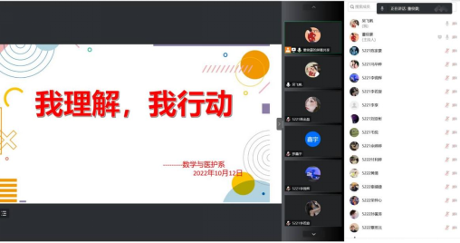 本网讯(见习记者 张子慧)10月12日,在遵循疫情防控要求的前提下,数医系各班陆续开展“我理解,我行动”防疫主题的线上班会。本次班会旨在加强同学们对学院防疫政策的了解,倡导同学们严格遵守社区和学院的防疫要求,进一步提高同学们的防疫意识。同时再次提醒同学们提高电信网络诈骗的警惕性,班会由辅导员主持。