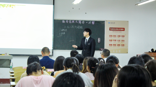 本网讯(见习记者 赵家乐)5月27日晚6:00~8:30,我系在四教201成功举办了“数学竞技大舞台”决赛。本次决赛的评审团成员为:史千里主任、冉庆鹏老师、康书记、黄瑾老师和系辅导员李佳老师,参加活动的观众有数学专业的部分同学。本次活动由学习部干事白梦竹主持。