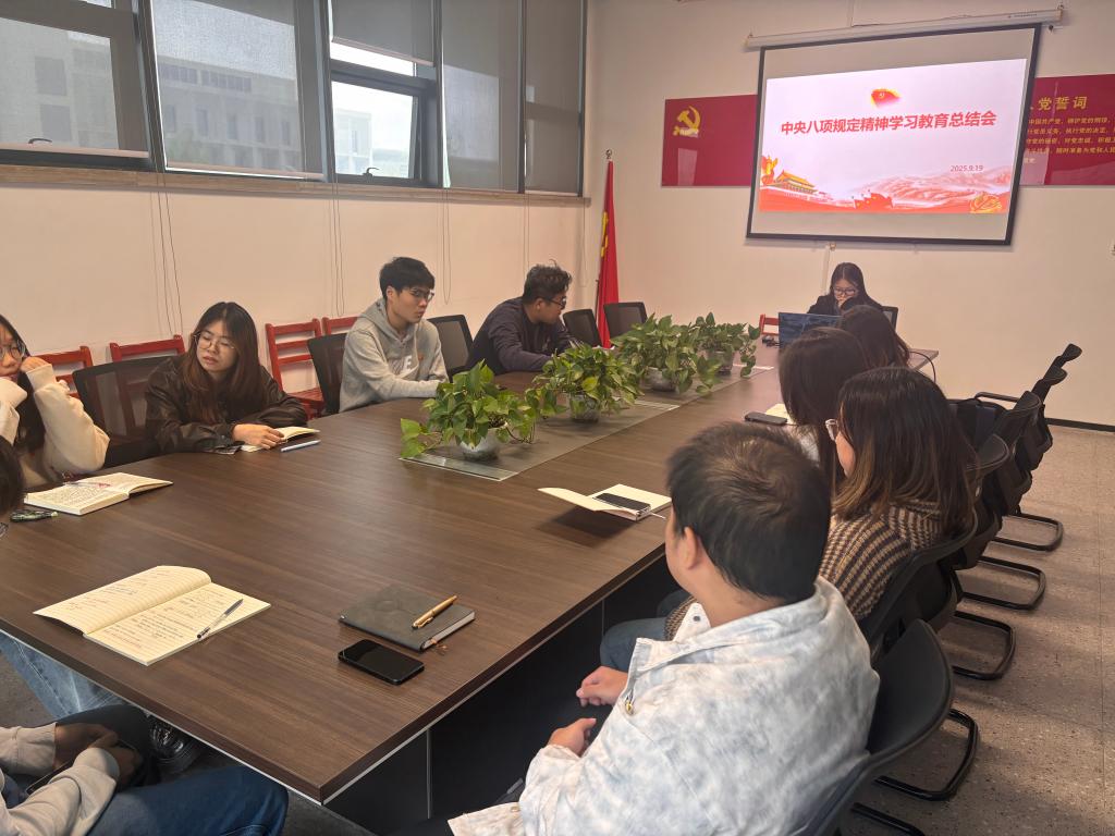 接下来,支部召开了中央八项规定精神学习教育总结会。自中央八项规定精神学习教育启动以来,我支部严格按照上级部署要求,精心组织、扎实推进,通过集中学习、个人自学等多种形式,组织全体党员深入学习《习近平关于加强党的作风建设论述摘编》和中央八项规定及其实施细则精神。通过学习,全体党员的思想认识显著提高,对中央八项规定精神的重要性和紧迫性有了更深刻的理解,进一步筑牢了贯彻落实的思想根基。会上,学生党员代表结合自身学习与实践经历作交流发言,阮佳莹同志谈到:“通过学习,我深刻认识到中央八项规定不仅是对党员干部的要求,更是对青年党员的行为准则。作为学生党员,我们要从‘节约一粒粮、杜绝一次学术不端、拒绝一次铺张浪费’做起,把作风建设融入日常学习生活。”