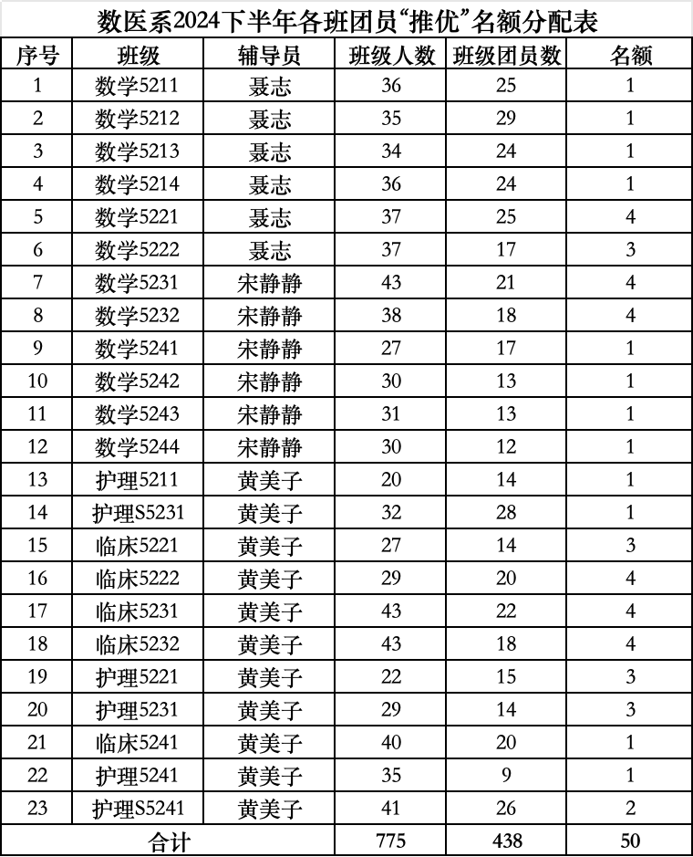根据williamhill官网团委《关于做好2024年下半年团员“推优”工作的通知》要求,现将数医系各团支部团员“推优”名额分配公示如下: