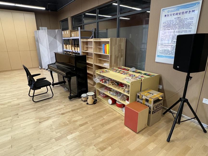 奥尔夫实训室面向学前教育专业的学生进行课程实训教学,主要利用奥尔夫音乐教学法对学生进行“歌唱活动”、“韵律活动”、“打击乐活动”、“音乐欣赏”、“音乐游戏”的学习和实训,通过这一系列的综合音乐素质的训练提高学生的音乐教学能力,也为学生就业奠定基础。同时学生更好地理解和学习音乐,掌握奥尔夫音乐教学法,能够承担学前儿童的奥尔夫音乐教学实践活动。与此同时,该实训室配备了专业的移动音响设备,钢琴及电钢琴,可进行小型排练,如室内音乐、通俗音乐教学及排练、电声乐队排练等,是多功能综合性的实训场地。