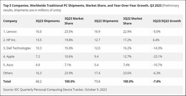 2023年第三季度全球PC市场出货量前五的厂商分别是:联想、惠普、戴尔、苹果和华硕,除了惠普实现增长外,联想、戴尔、苹果和华硕出货量均有不同程度的比下滑,其中苹果出货量环比下降23.1%。