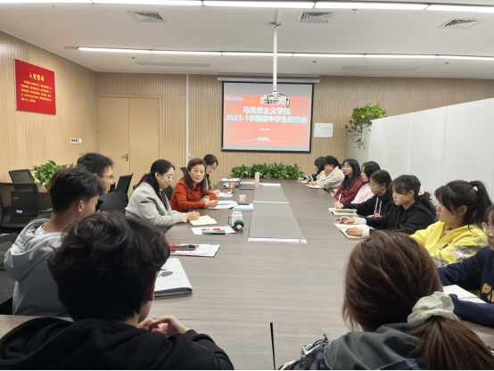 2023年11月9日下午四点整,马克思主义学院召开2023-2024第一学期期中学生座谈会,本次参会的人员有长江大学资深教授贾廷秀老师,专业课老师田丹老师、李晶晶老师、郭世德老师,辅导员李天赐老师以及每个寝室的学生代表,共计17人。