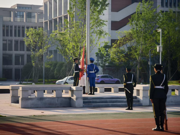 国旗护卫队队员们迈着整齐的步伐,护送国旗走向升旗台,五星红旗在庄严的国歌声中冉冉升起。