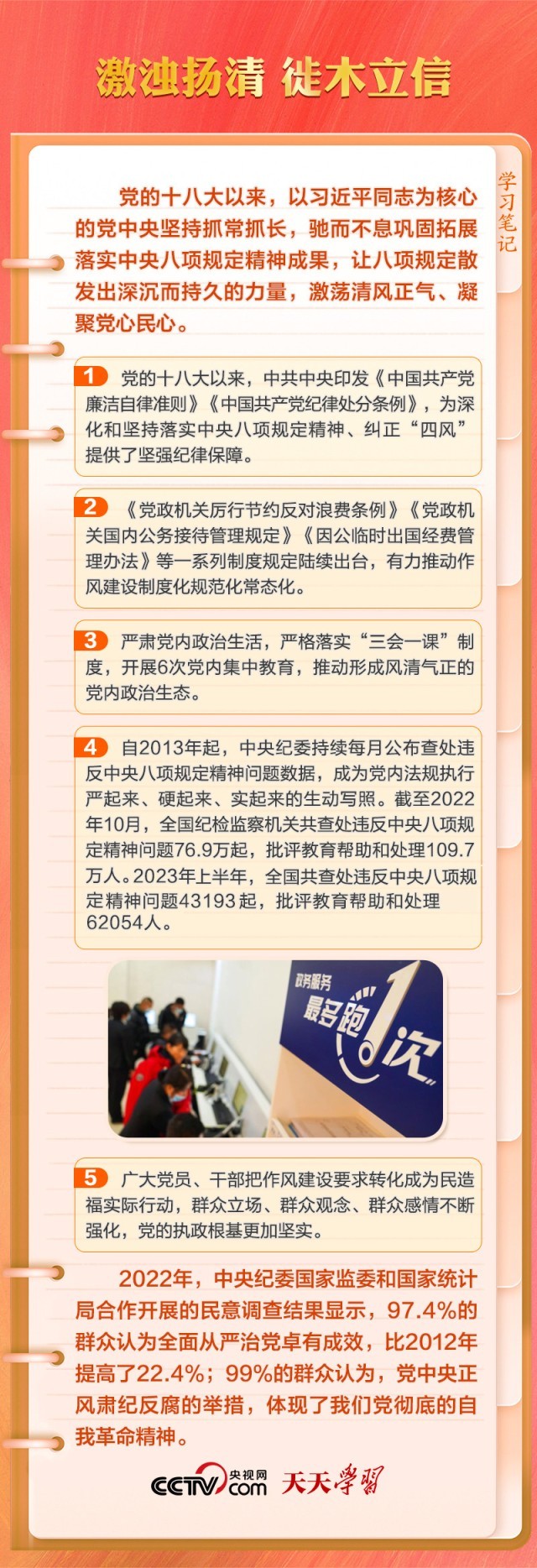 在二十届中央纪委二次全会上,习近平总书记指出:“制定实施中央八项规定,是我们党在新时代的徙木立信之举,必须常抓不懈、久久为功,直至真正化风成俗,以优良党风引领社风民风。”