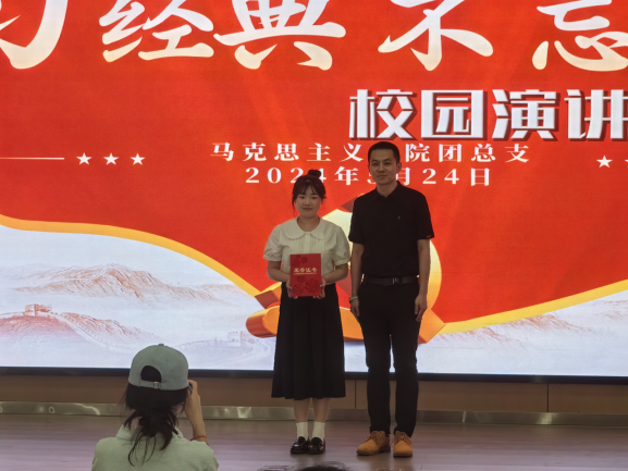 经过评委现场打分,比赛成绩出炉:谭娥获一等奖,潘娆、陆疆宇获二等奖,钱映竹、邓喜洋、陈雪莎获三等奖,张恒、王洁等获优秀奖。校团委书记陈海波和马克思主义学院领导分别登台为获奖选手颁奖。