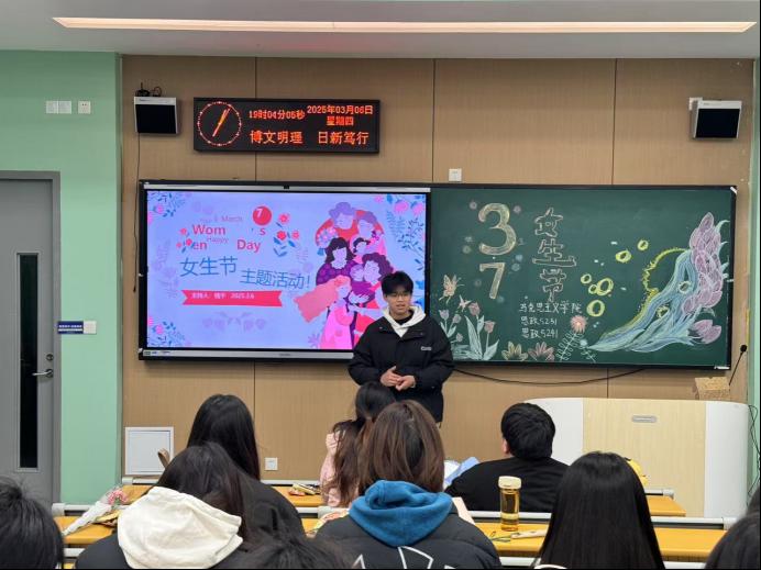 本网讯(通讯员 陈冠宇)为弘扬女性力量、增进师生情谊,2025年3月6日晚,马克思主义学院于教学楼A-110S教室举办"3.7女生节"主题活动。活动由钱干同学主持,特邀学院副教授郭世德、史苗苗及辅导员李天赐出席,思政5231、5241班全体学生参加。