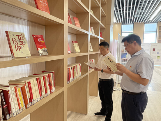 活动在诗歌朗诵《党在我心中》中拉开序幕。机关三支部全体党员满腔热情在齐诵中歌颂中国共产党百年征程的波澜壮阔,展现百年初心的历久弥坚。副院长尹家经、孙细望,院长助理郭明虎带领机关三支部党员在图书馆党建中心参观学习。