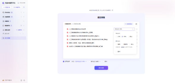 平台提供全方位的学术审查服务,通过先进的AI技术进行多维度的文献审核。系统集成了重复率检测、AIGC内容识别和审稿质量评估功能,可从论文结构完整性、研究方法规范性、数据分析可靠性等维度进行评估,并提供有针对性的修改建议,帮助提升论文质量。