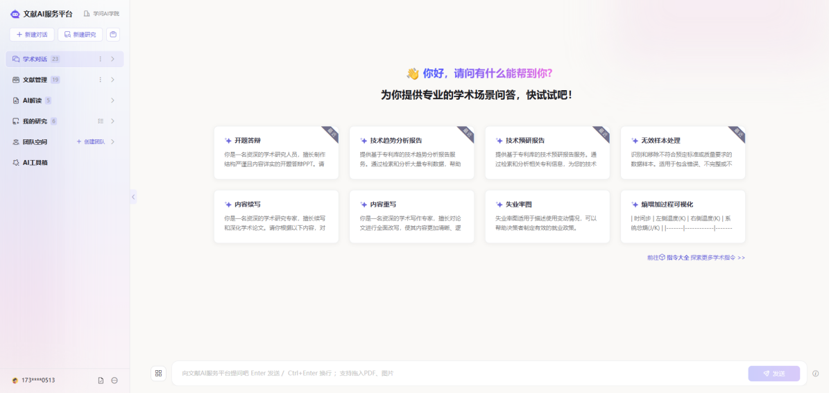 指令大全基于高频率高需求的学术场景预设指令,涵盖智能写作、可视化、数据分析、学术PPT、学术资源、代码助手、学术思维等广泛学术场景