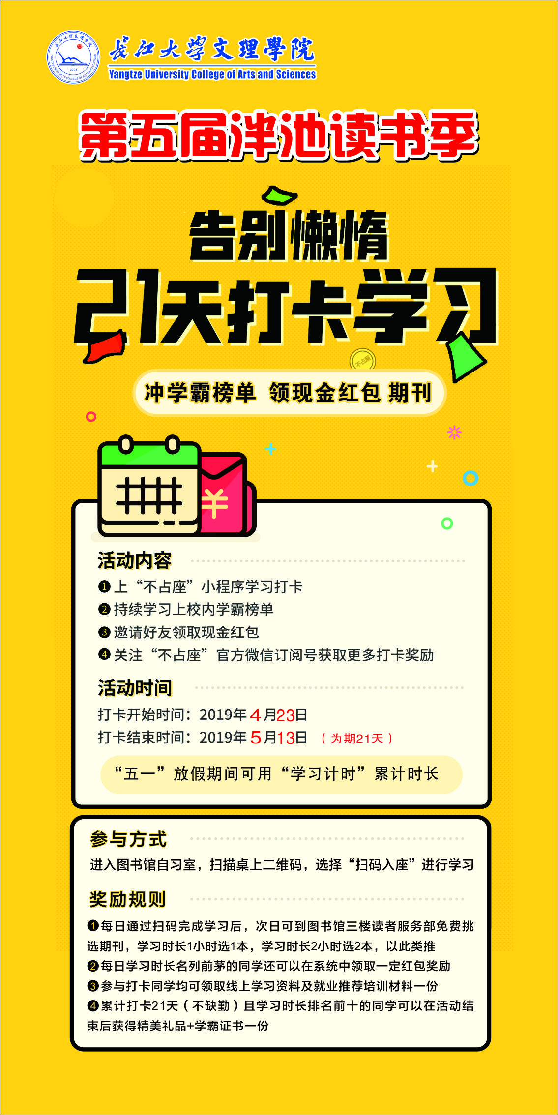 大学期间是我们通过学习完善知识、增长才干、塑造性格的黄金时期。为了激励大家在这一时期充分利用图书馆动态资源进行广泛阅读、培养良好的学习习惯、激发学习的主动性,图书馆决定开展“泮池读书季—21天早起打卡学习计划”活动,欢迎广大同学积极参与!