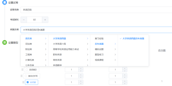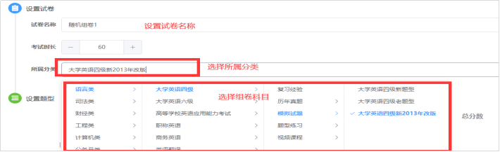 主要步骤包括:添加试卷名称、修改考试时间、试卷总分、选择试题类型、确认试卷信息后,即可生成一套完整的单一题型试卷。