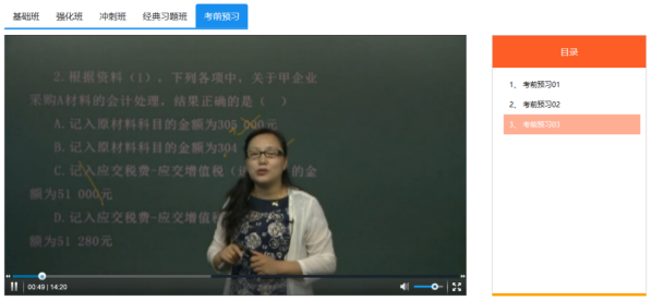 点击 “初级会计”的“视频课程”,进入视频课程详细页面,看到该课程分类和课程列表