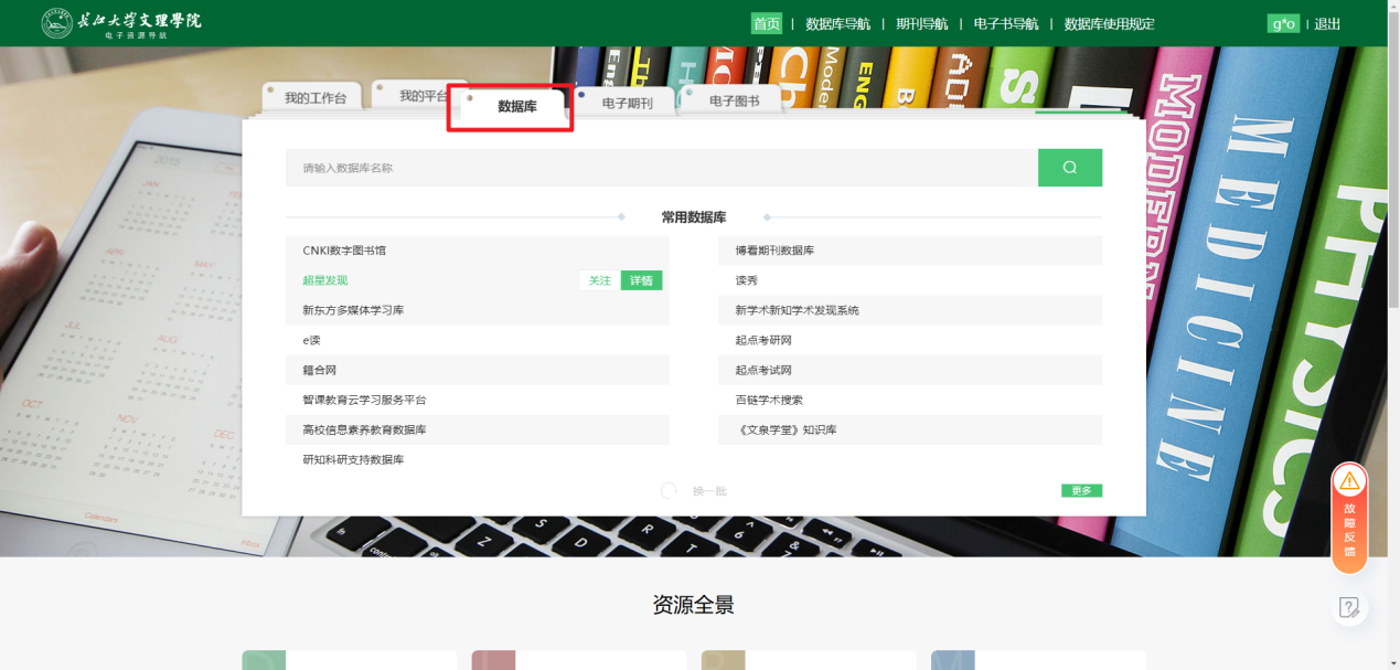 数据库导航将学校拥有的数据库进行统一展示,在搜索栏中输入数据库名称即可完成搜索。