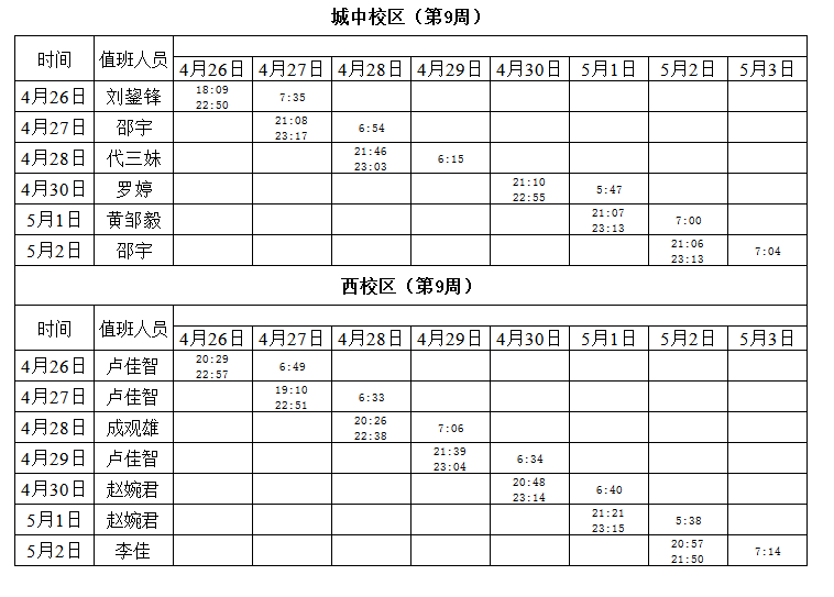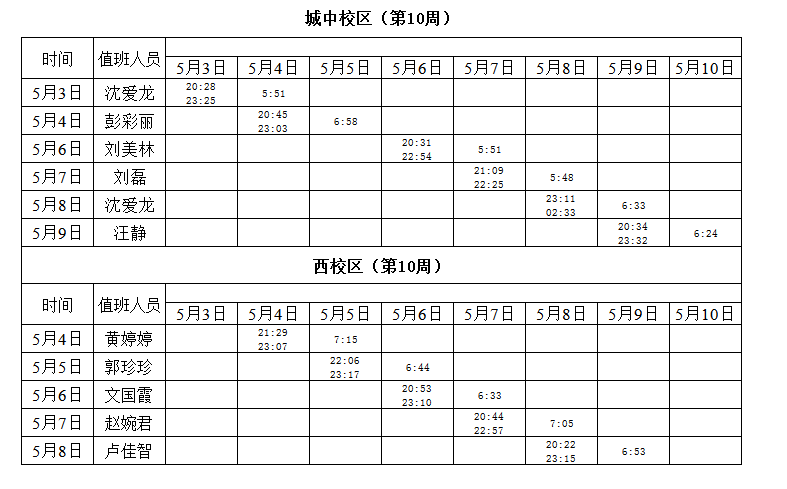 2020-2021学年第二学期第9-10周学工人员寝室值班通报