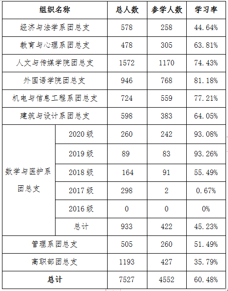 williamhill官网第十一季第十一期青年大学习各院(系、部)团总支学习情况公示