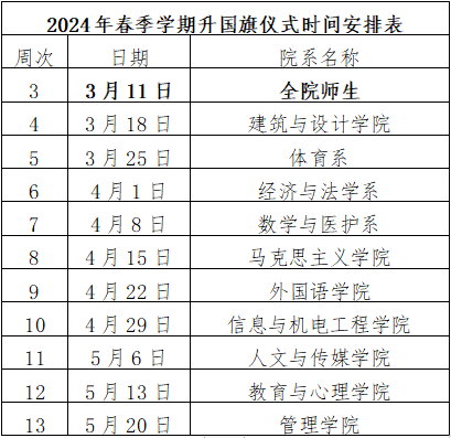 4.请各教学单位按照时间安排,结合当前时代背景,认真策划,精心组织,加强宣传教育,并于升旗前一周周四将活动方案发送学生工作部郭松明老师。