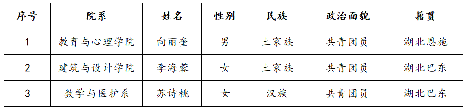 为做好2024—2025年度大学生志愿服务西部计划志愿者招募选拔工作,根据西部计划湖北省项目办招募方案要求,本着“公平、公正、公开”的原则,结合学院工作实际,在自愿报名、资格审查、笔试、面试等环节的基础上,拟增补以下3名毕业生为2024—2025年度大学生志愿服务西部计划志愿者,现将名单予以公示: