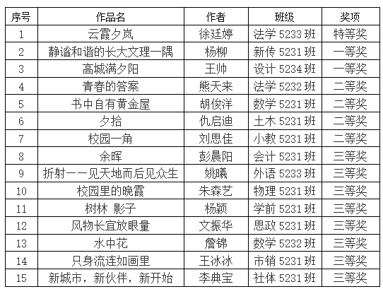 “初次遇见‘你’”校园随手拍活动自开展以来,获得了我院新生的积极响应,共收到85件作品。经综合评审,共选出获奖作品15件。名单如下: