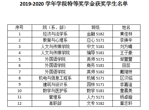 根据《williamhill官网学生奖学金评定及奖励办法》(文理行发[2020]20号)文件要求,经学生个人申请、院(系、部)推荐、学院学生资助管理中心材料核查、学生现场自述、学院评审小组评分,并经学院党政联席会研究通过,黄佳林等12名本、专科学生为2019-2020学年学院特等奖学金获得者。现将获奖学生名单予以公示,如对评审结果有异议,请实事求是、客观公正地向学院反映。