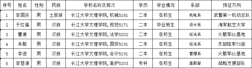 通过荆州区武装部组织的体检、政审考核、心理测试、役前训练等环节,我院于红福等6名同学经湖北省荆州市荆州区人民政府征兵办公室批准光荣入伍,现根据相关规定予以公示,公示时间为2021年3月18日至3月23日。如有异议,请在公示期内向学院纪检监察部或荆州区武装部进行反映。