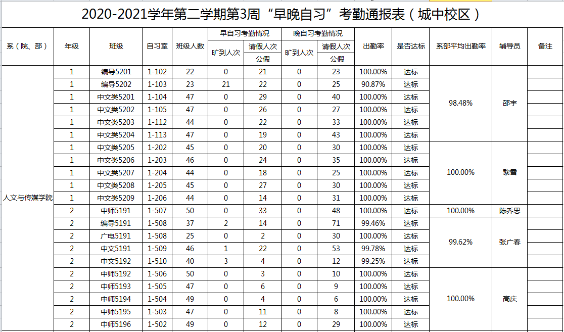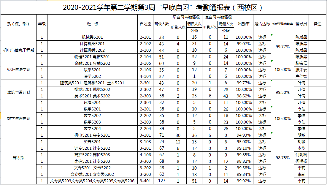 2020-2021学年第二学期第3周系(院、部)早晚自习考勤通报
