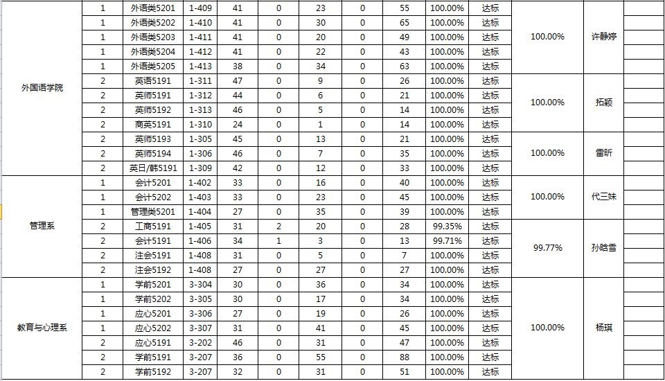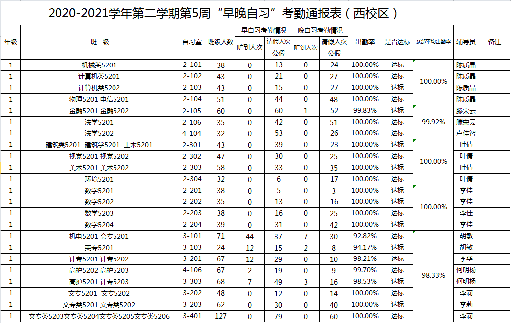 2020-2021学年第二学期第5周系(院、部)早晚自习考勤通报