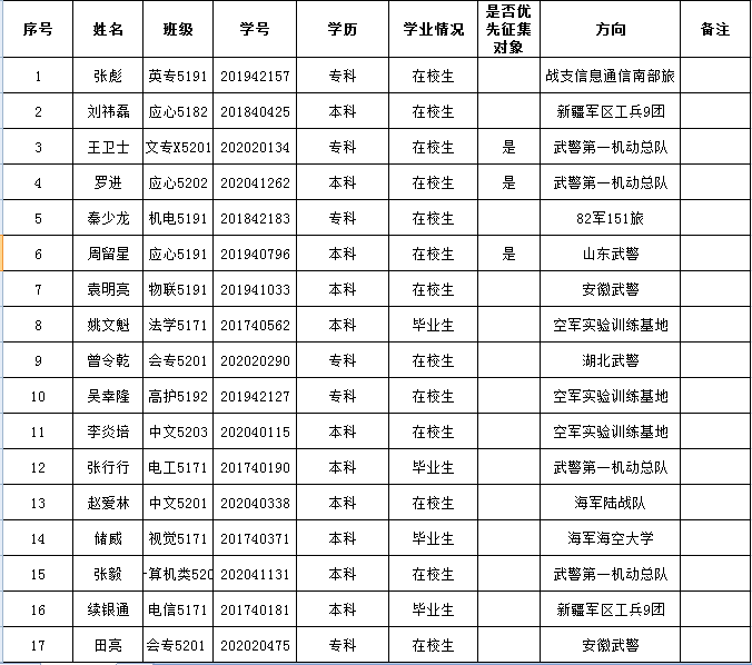 通过荆州区武装部组织的体检、政审考核、心理测试、役前训练等环节,我院张行行等16名同学经湖北省荆州市荆州区人民政府征兵办公室批准光荣入伍,现根据相关规定予以公示,公示时间为2021年9月18日至9月23日。如有异议,请在公示期内向学院纪检监察部或荆州区武装部进行反映。