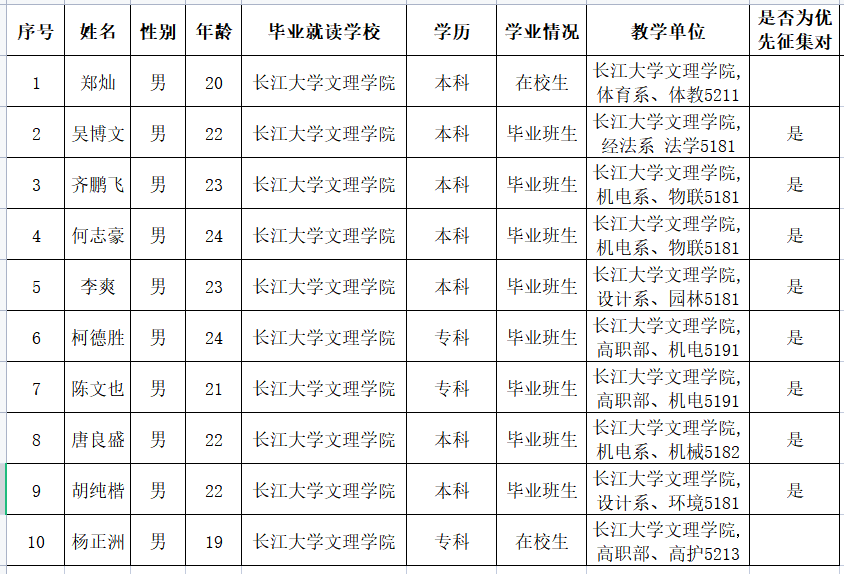 通过荆州区武装部组织的体检、政审考核、心理测试、役前训练等环节,我院齐鹏飞等10名同学经湖北省荆州市荆州区人民政府征兵办公室批准光荣入伍,现根据相关规定予以公示,公示时间为2022年3月11日至3月15日。如有异议,请在公示期内向学院纪检监察部或荆州区武装部进行反映。