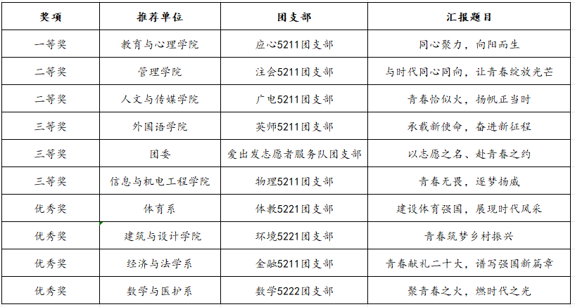 根据《关于在全省高校共青团组织中继续深化“百生讲坛”——学习宣传贯彻习近平新时代中国特色社会主义思想活动的通知》要求,按照评选细则,经团支部申报、各学院团总支推荐、校级校赛选拔,现将获奖名单公示如下,同时院团委将报送前五名的团支部至团省委参与省级“百生讲坛”活力团支部选拔活动。