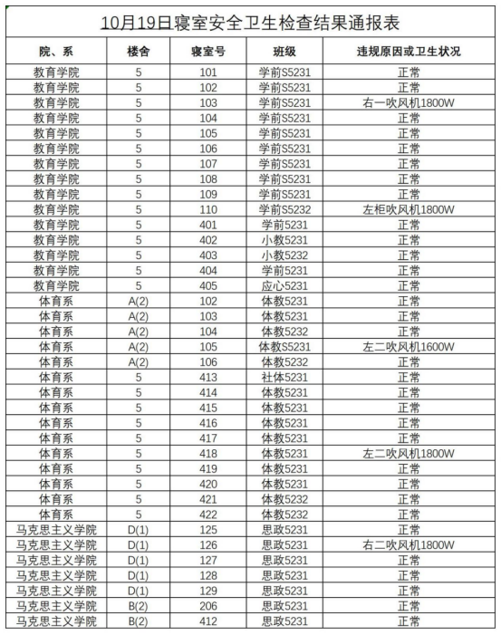 2023-2024学年第一学期第八周寝室安全卫生检查结果通报