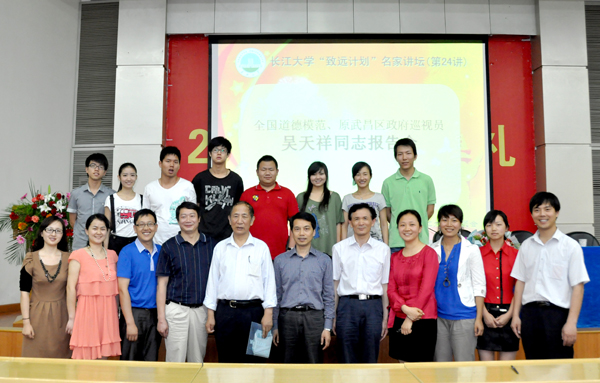 本网讯(通讯员 黄梦婷)5月31日,全国道德模范吴天祥先进事迹报告会在长江大学12教405报告厅举行。长江大学党委副书记朱业宏、学院党委书记袁先海、医学院党总支书记曾成义出席大会,校团委书记刘小燕主持报告会。