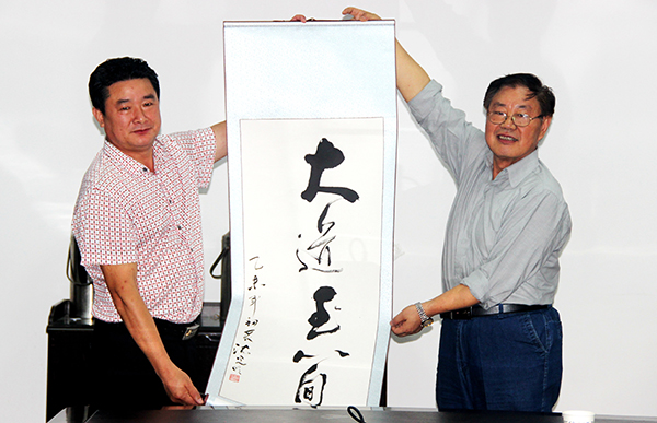 长江大学“关工委”专家(右)向我院捐赠草书作品《大道至简》