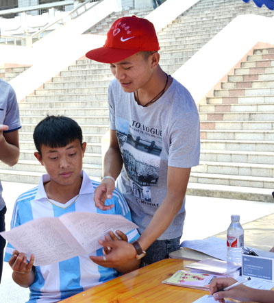 青年志愿者指导献血者填写报名表